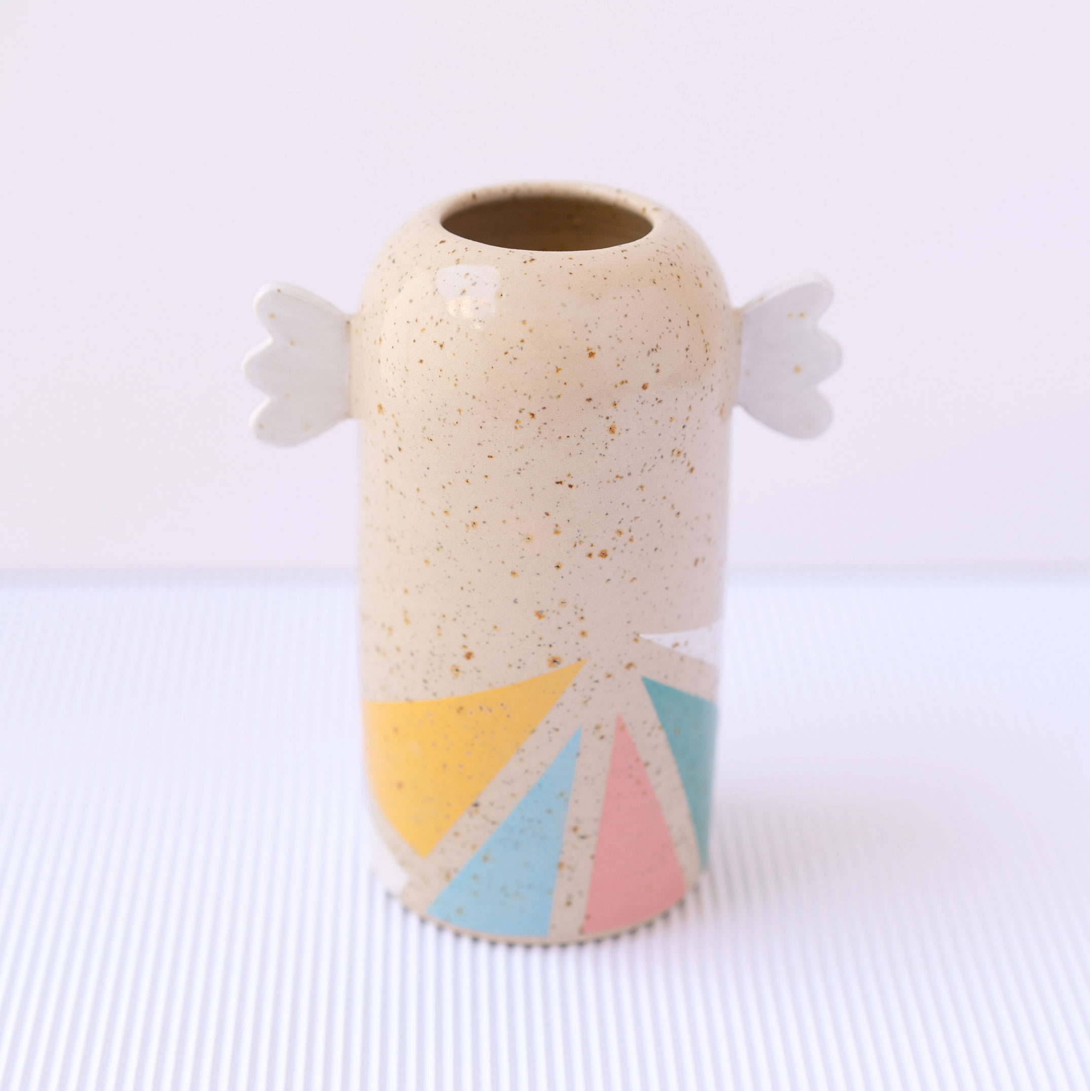 Handmade speckled stoneware vase with a color block design.