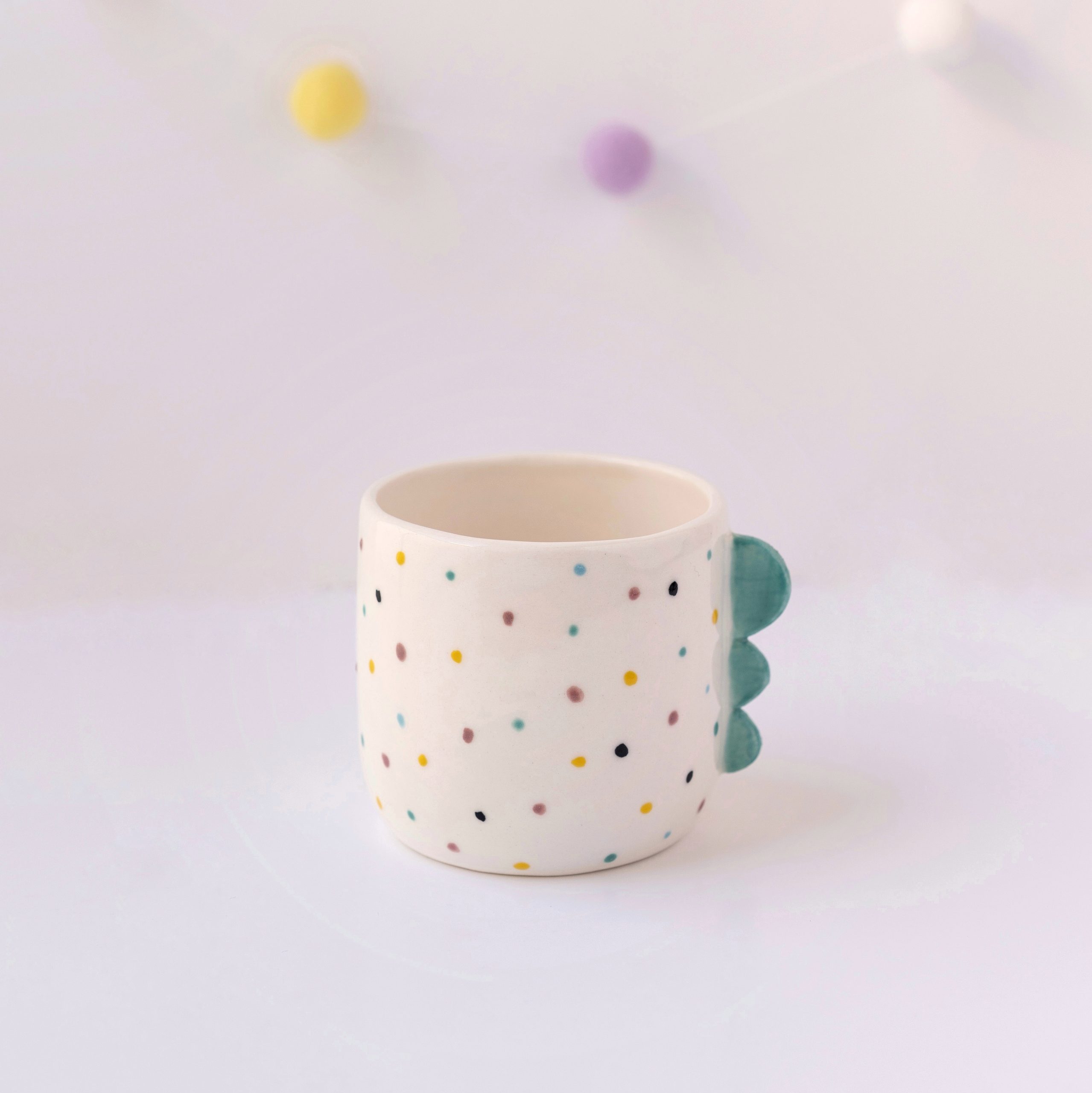 Unique handmade porcelain cup with a multicolor polka dot design.