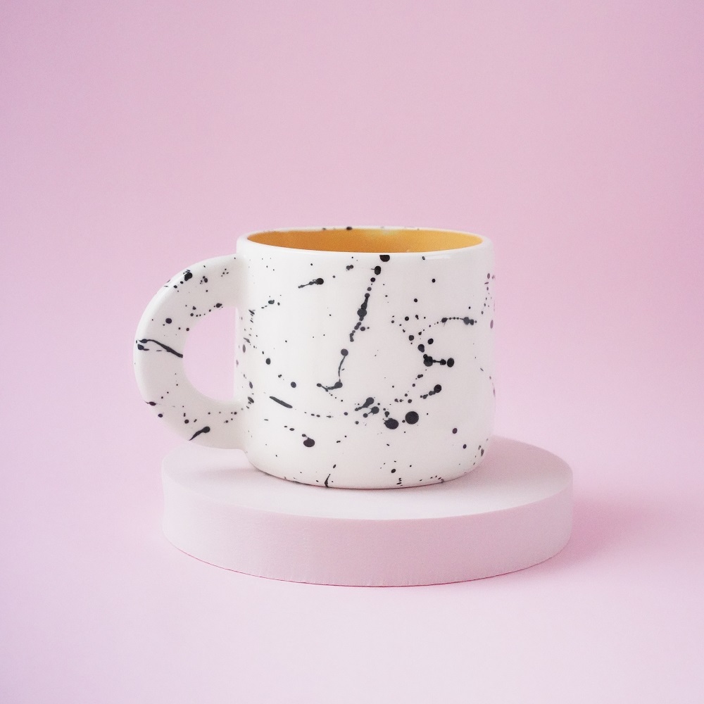 This is a handmade porcelain mug. It has a black splatter on the outside and it’s yellow on the inside. Glazed with glossy transparent glaze.